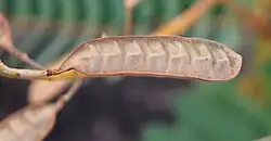 Die gerade, flache, bei Reife braune[1] Hülsenfrucht ist 4 bis 8 Zentimeter lang und 6 bis 10 mm breit. Die Samen sind matt.[2]