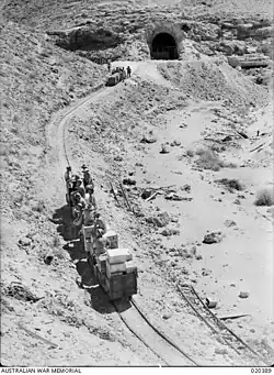 - ↑ Australian War Memorial, Nr. 020390: Small freight train loaded with stores.