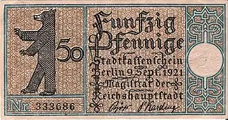 In Berlin erschien eine Notgeldserie von 50-Pfennig-Stadtkassenscheinen datiert auf 9. September 1921. Sie besteht aus 20 Scheinen mit je einem Schein pro Stadtbezirk. Die andere Seite zeigt bei allen Scheinen der Serie Links den Berliner Bären und die laufende Nummer, Rechts das geprägte Siegel des Magistrats und in der Mitte und die Unterschriften von Bürgermeister Gustav Böß und Stadtkämmerer Ernst Karding.