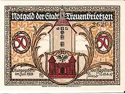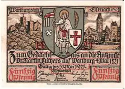 In der Wartburgstadt Eisenach erschien eine Serie, bestehend aus sechs 50-Pfennig-Scheinen, mit dem Aufdruck „Zum Gedächtnis an die Ankunft Dr. Martin Luthers auf Wartburg 4. Mai 1521“. Links ist die Wartburg, in der Mitte das Eisenacher Stadtwappen und rechts das Eisenacher Zentrum abgebildet. Unten sind die Unterschriften von Oberbürgermeister, Kämmerer und dem Wirklich Geheimen Rat Eisenachs zu sehen. Die Gültigkeit war bis 31. Mai 1921 beschränkt.