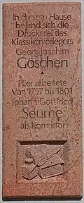 Hier befand sich die Druckerei, wo Seume als Göschens Korrektor wirkte. Die Ausstellungsstücke erinnern daran. Von hier aus machte sich Seume 1801 auf seinen berühmten Spaziergang nach Syrakus. Im Eingangsbereich steht eine Statue Seumes mit Tornister und Wanderstock, was an diesen Vorgang erinnert. Das Gebäude stammte aus dem 16. Jahrhundert und besitzt Wandmalereien und Inschriften aus dem Jahre 1632, die bei Restaurierungsarbeiten aufgetaucht sind. Auffallend ist auch der Erker des dreigeschossigen Renaissancebaus. Auch dieses Gebäude hatte Schäden durch Hochwasser wie dem von 2002.[1] Das war auch vom Hochwasser Mai/Juni 2013 der Fall, in dessen Folge die freistehende Hochwasserschutzmauer mit verschließbaren Toranlagen und eine unterirdische Dichtwand als Bohrpfahlwand an der Mulde errichtet wurden.[2] Auffällig sind die flach gewölbten Gaupen auf dem mit Biberschwänzen gedeckten dreigeschossigen Dach.[3] Erhalten geblieben ist auch eine Probedruckpresse der Göschen’schen Druckerei, die aber sich nun im Göschenhaus befindet.[4]