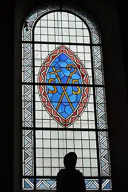 Fenster in der Kirche Notre-Dame in Château-Landon mit den Initialen des heiligen Severinus von Agaunum