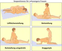 Im ersten Trimenon kann Schwangerschaftsübelkeit den Wunsch der Frau nach Sex verhindern. Dennoch zeigte eine Studie, dass die befragten Frauen im ersten Trimenon am häufigsten Vaginalverkehr hatten.[1][2] Im zweiten Trimenon erleben ihn viele Frauen als aufregend und befriedigend.[3] Ein Teil der Frauen verspürt stärkere sexuelle Lust, u. a. infolge gesteigerter Durchblutung ihrer Genitalien, wodurch sie Berührungen intensiver wahrnehmen.[4] Auch der durch die Schwangerschaft eingetretene Umstand, dass die Frau nicht an Empfängnisverhütung zu denken braucht, kann ihre sexuelle Lust fördern.[5] Ab dem zweiten und besonders im dritten Trimenon sind nur Sexstellungen geeignet, bei denen kein Druck auf den Bauch der Schwangeren ausgeübt wird.[6] Die Nutzung mancher Sexpositionen nimmt daher ab.[7] Eine Studie zeigte mehr sexuelle Zufriedenheit bei Frauen, die ohnehin die Löffelchenstellung, Reiterstellung und Doggystyle bevorzugen.[8]