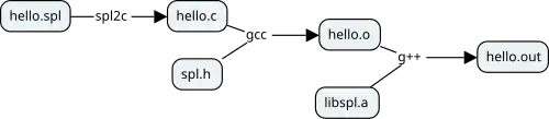 Im ersten Schritt wird mit dem vom Entwickler bereitgestellten Programm „spl2c“ der Programmcode von SPL nach C konvertiert, anschließend wird dieser im zweiten Schritt mit dem C-Compiler gcc und mithilfe der vom Entwickler bereitgestellten Header-Datei „spl.h“ kompiliert. Im letzten Schritt wird dann das kompilierte Programmmodul „hello.o“ mit einer ebenfalls vom Entwickler bereitgestellten Bibliothek „libspl.a“ gelinkt und ein ausführbares Programm ist entstanden.
