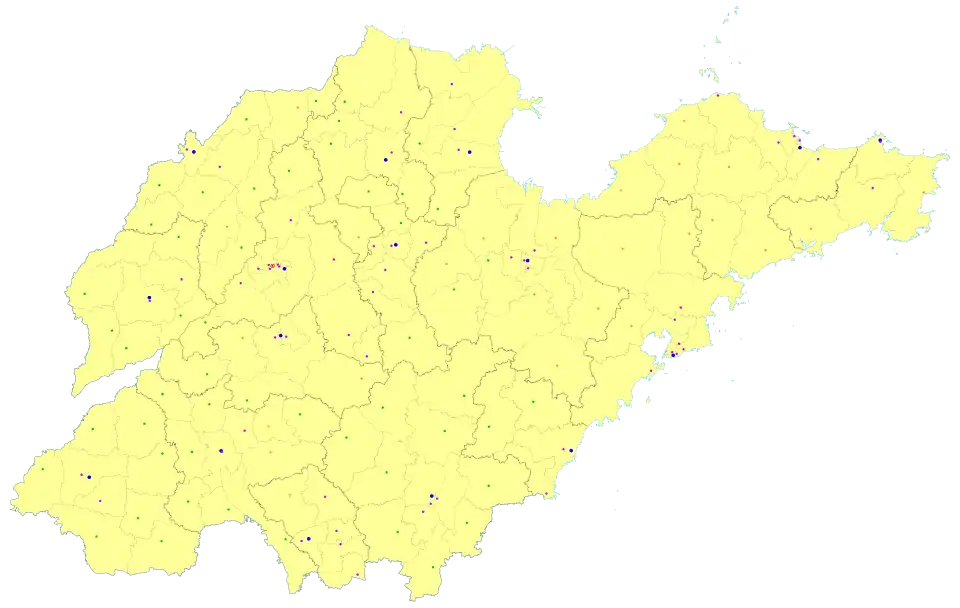 - ↑ a b 山东省第七次全国人口普查公报[1](第二号) („Bulletin zur siebten nationalen Volkszählung in der Provinz Shandong (Nr. 2)“). 21. Mai 2021, abgerufen am 26. September 2024 (chinesisch (vereinfacht)).