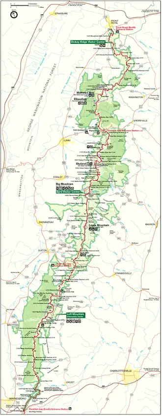 Der US-amerikanische Nationalpark Shenandoah-Nationalpark umfasst etwa 800 Quadratkilometer[1] der Blue Ridge Mountains in den südlichen Appalachen in der Nähe des Piedmond Plateaus in Virginia. Er ist ein schmaler Korridor von dichtbewaldeten Kämmen und Wäldern mit zahlreichen Flüssen und Wasserfällen mit einem breiten Tal auf jeder Seite. Die höchsten Erhebungen, Stony Man und Hawksbill, sind über 1200 Meter hoch.