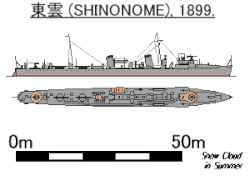 Die spätere Shinonome wurde am 1. Oktober 1897 zusammen mit ihrem Schwesterschiff Murakumo auf der Thornycroft-Werft im englischen Chiswick (London) auf Kiel gelegt. Der Stapellauf erfolgte am 15. Dezember 1898 und die Indienststellung am 1. Februar 1899, wurde aber am 22. Juni 1900 zum Zerstörer umklassifiziert.[1][2]