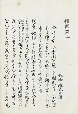 Mit dem Anwachsen der Kontaktversuche durch westliche Schiffe rückten die Beziehungen Japans zum Ausland immer stärker ins Bewusstsein der Machthaber wie auch der allgemeinen Bevölkerung. Shizuki stieß bei seinen Studien auf eine Abhandlung des Japanforschers Engelbert Kaempfer zur Beziehung Japans mit der Außenwelt.[10] Bei seiner Übersetzung komprimierte er den sperrigen, langen Titel Kaempfers zu „Abhandlung über den Landesabschluss“ (sakoku-ron).[11] Der hierdurch in die japanische Sprache eingeführte Begriff sakoku setzte sich im Laufe der zweiten Hälfte des 19. Jahrhunderts als Schlüsselbegriff zur Charakterisierung der japanischen Außenpolitik der Edo-Zeit auch im allgemeinen Sprachgebrauch fest.[12]