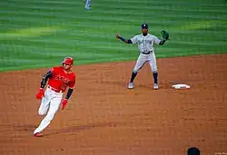 In der Saison 2019 kehrte Ohtani erst am 7. Mai in das Line Up der Angels zurück und beendete sein erstes Spiel der Saison ohne einen Hit.[41] Der erste Home Run der Saison gelang ihm am 13. Mai 2019.[42] Am 13. Juni 2019 wurde Ohtani der erste japanische Spieler in der MLB, der einen Cycle (jeweils einen Single, Double, Triple und Home Run in einem Spiel) erzielen konnte.[43] Ohtani beendete die Saison 2019 mit einem Batting Average von .286.[44] Er wurde in dieser Saison nicht als Pitcher eingesetzt. In der darauffolgenden Saison 2020, die maßgeblich von der COVID-19-Pandemie geprägt und deshalb auf 60 statt der üblichen 162 Spiele verkürzt war, wurde Ohtani nur in zwei Spielen für insgesamt 1 2/3 Innings als Pitcher eingesetzt. Dabei wurden von gegnerischen Battern 7 Runs erzielt, weshalb er einen außerordentlich hohen ERA von 37,80 besaß. Aufgrund von Schmerzen im Wurfarm wurde er fortan, ebenso wie in der Saison 2019, nur noch als DH eingesetzt. Doch auch als Batter war er 2020 mit einem Batting Average von .190 und 7 Home Runs nur mäßig erfolgreich.[44] Die Saison 2021 markierte die Rückkehr von Ohtani als „two-way player“ in den Positionen des Pitchers und DHs. In mehreren Spielen wurde er sogar abwechselnd in beiden Positionen eingesetzt.[45] Im Juni 2021 wurde Ohtani zum Spieler des Monats in der American League ernannt.[46] Als erster Spieler in der Geschichte der MLB wurde Ohtani gleich in zwei Positionen – als DH sowie als Pitcher – in das MLB All-Star Game gewählt.[47] Am 3. Juli 2021 erreichte er als erster Spieler in der Saison 2021 die 30-Home-Runs-Marke.[48]
