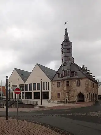 Im Neuen Rathaus im hessischen Korbach wurde beim Gießen der Betonfassade rezyklierte Gesteinskörnungen aus dem Abbruch der Bestandsgebäude verwendet, um ein lebhaft strukturiertes Oberflächenbild zu erhalten.[24][25]