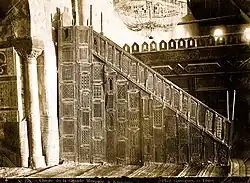 Es ist auf der ND-Photographie (Louis-Antonin Neurdein - Nūreddīn - 1846-1914, Paris) deutlich erkennbar, dass mit der Aufstellung der Kanzel die ursprüngliche Symmetrie der Miḥrābwand unterbrochen und Reihen der Lüsterfliesen verdeckt worden sind.[64]