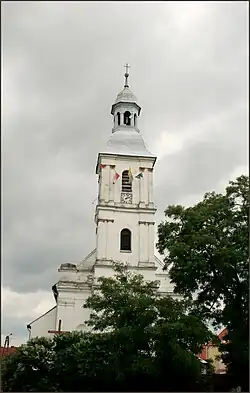 - Die römisch-katholische Kirche St. Peter und Paul (poln. Kościół św. Piotra i Pawła) bestand bereits seit im 14. Jahrhundert. 1651 entstand ein steinerner Bau, welcher 1824 erweitert wurde. Umgeben ist die Kirche von einer steinernen Mauer aus dem 17. Jahrhundert. Das Kirchengebäude wurde 1966 unter Denkmalschutz gestellt.[9]