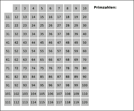 Verfahren, wie die Primzahlen zwischen 2 und 120 ermittelt werden: Erst werden alle Vielfachen von 2 gestrichen, dann alle Vielfachen von 3, 5, und 7. Die Markierungen beginnen jeweils mit dem Quadrat der Primzahl: 4, 9, 25, 49. Da bereits 112 = 121 nicht mehr im Wertebereich liegt, werden ab 11 keine zusammengesetzten Zahlen mehr markiert; alle noch unmarkierten Zahlen sind prim.