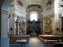 An den Kuppelpfeilern zuseiten des Choreingangs fanden Kreuzaltar und Kanzel Aufstellung. Die Altarfiguren stammen von dem Passauer Bildhauer Giovanni Battista d’Allio, die Fresken schuf der Prager Maler Wenzel Lorenz Reiner. 1760–1761 erhielt die Kirche eine Orgel mit zweigeteiltem Prospekt sowie einem Rückpositiv mit rückwärtig angebautem Spieltisch aus der Werkstatt von František Fialka in Bechyně.[1]