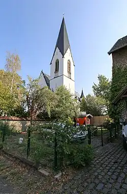 Die 1908/09 erbaute Kirche entstand unweit des Standortes der ehemaligen Kapelle „Mater Dolorosa“ am Anfang des 1925 begradigt ausgebauten Kirchweges.[13] Sie liegt eingefriedet im Dorfkern und ist eines der denkmalgeschützten Bauwerke Uckendorfs.