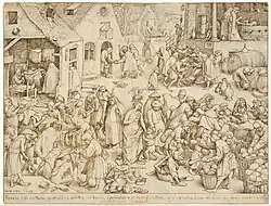 „Was ihr für einen meiner geringsten Brüder getan habt, das habt ihr mir getan“. Dieser Liste wurde im Mittelalter, um die Siebenzahl vollzumachen, noch das Bestatten der Toten hinzugefügt. Seit dem 12. Jahrhundert lassen sich Darstellungen dieses Themas finden, wobei es einen besonderen Schwerpunkt im 16. Jahrhundert gibt. Üblicherweise wurden Beispiele der sieben Werke als Serie unter einem Christus als Weltenrichter angeordnet.[6] Eine Zusammenfassung aller sieben Werke in einer einzigen Szene findet sich bis dahin nur in der protestantisch geprägten flämischen Malerei, erstmals bei Pieter Brueghel der Ältere 1559.[7]