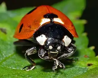 Die Käfer werden 5,2 bis 8 Millimeter lang und haben einen leicht gestreckten, stark gewölbten und runden Körper. Die Deckflügel sind rot gefärbt und haben jeweils drei schwarze Punkte. Ein siebter schwarzer Punkt, nach vorne von zwei weißen, dreieckigen Flecken flankiert, findet sich auf dem Schildchen (Scutellum, auf dem oberen Bild mittig geteilt). Der Halsschild ist bis auf die weißen vorderen Ecken schwarz gefärbt. Diese erstrecken sich als schmaler Saum auch auf die Unterseite des Halsschildes. Auf dem schwarzen Kopf befinden sich an der Innenseite der schwarzen Facettenaugen zwei weiße Punkte.