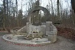 Der imposant wirkende Brunnen besteht aus einem etwa 6 Meter hohen Bogenportal und einer oben angebrachten Zirbelnuss. Unterhalb des Bogens befindet sich eine Mauer mit vorgelagertem Muschelkalkbecken. Der Entwurf für die Brunnenanlage stammt von dem Augsburger Bildhauer Jakob Rehle.[3] Hinterhalb des Brunnens ist auf einer kleinen Anhöhe eine massive Steinbank angeordnet.