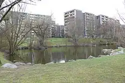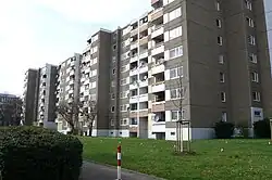 Der zentrale Grünzug umfasst rund drei Hektar und ist als landschaftlicher Park mit ausgedehnten Rasenflächen, Bäumen, Wegen und Spielplätzen gestaltet. Die bewegte Topographie gliedert die Grünanlage in unterschiedliche Bereiche. Am tiefsten Punkt im Norden befindet sich ein kleiner See. Die soziale Infrastruktur umfasst ein Bürgerhaus, zwei Kindertagesstätten (Kita 1 und Kita 71), ein Jugendhaus, ein Sozialrathaus, und ein Begegnungs- und Servicezentrum. Die beiden christlichen Kirchen sind mit Gemeindehäusern, Kindergarten, evangelischem Kirchsaal und der katholischen Kirche St. Lioba vertreten. Im Osten liegt eine Ladenpassage mit Geschäften für den täglichen Bedarf und ein Ärztehaus.