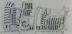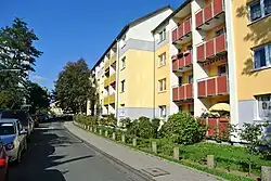 Die Bauten des ersten Abschnitts sind meist straßenbegleitend angeordnet und weisen drei Geschosse auf. Die städtebauliche Ausformung der 1950er-Jahre-Bebauung folgt dem damaligen Leitbild einer aufgelockerten Stadt in Zeilenbauweise. Die viergeschossigen Wohngebäude stehen meist quer zur Straße und sind über Wohnwege erschlossen. Alle Mehrfamilienhäuser sind nach Westen bzw. Osten ausgerichtet und verfügen über große Grünflächen. Am westlichen Rand der Siedlung befinden sich Einfamilienreihenhäuser. Die fünf zweigeschossigen Häuserzeilen sind nach Süden ausgerichtet und umfassen 30 Wohnungen.