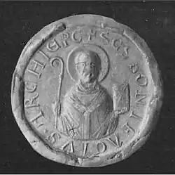 - Das runde Siegel ist durch Belege von 1168 und 1184 bekannt. Das Siegelbild ähnelt sich dem vom ersten Siegel, aber der Stab ist auswärts gerichtet, und das Buch ist mit einem Andreaskreuz aus zwei dünnen Linien geschmückt (sich schneidende Diagonalen der Buchdeckelecken). Die Umschrift ist in Majuskeln der Capitalis und der Unziale gehalten: + S(AN)C(TU)S BONIFACIVS ARCHIEP(IS)C(OPUS)