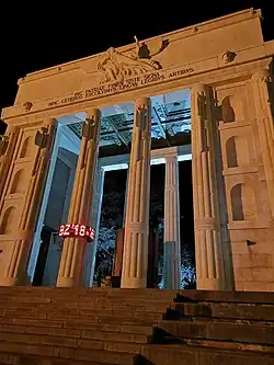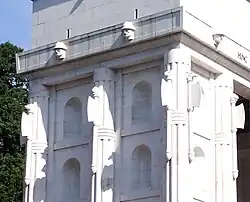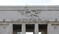 Die auf Mussolini verweisende Inschrift an der Südseite wurde nach dem Sturz des Faschismus entfernt. Weiter gut sichtbar sind die drei Fasces auf den Säulen, deren Beilschneiden nach außen zeigen und zwei behelmte Soldatenköpfe im Architrav.