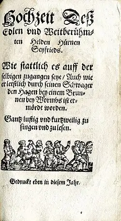 Das Lied von Siegfrieds Hochzeit schließt an einen Druck des Hürnen Seyfrits (hier Hürnen Seyfried) aus dem gleichen Jahr an.[1] Es wurde erst 2022 von Mario Bauch entdeckt. Drucker und Druckort sind nicht angegeben. Die Druckermarke verweist auf Johann Jakob Decker den Älteren, welcher in Basel und im Elsass druckte. Der Druck des Hürnen Seyfrieds von Decker schließt nachweislich an den Druck des Basler Druckers Johann Schröter aus dem Jahre 1594 an, welcher wiederum auf dem Druck des Siegfried Apiarius aus Bern 1561 basiert.