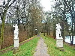 Von Osten kommend markieren zwei weiße Statuen, Diana zur Linken und die eines Fauns zur Rechten, den Eingang in den Wald des Sieglitzer Parks. Diese auf antike Vorbilder zurückgehenden Motive verweisen auf die Jagd, die ursprüngliche Bestimmung der Gegend.