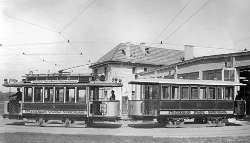 - ↑ Hans-Jürgen Kämpf: Die Straßenbahn in Spandau und um Spandau herum. Hrsg.: Heimatkundliche Vereinigung Spandau 1954 e. V. Berlin 2008, ISBN 978-3-938648-05-6, S. 109–110.