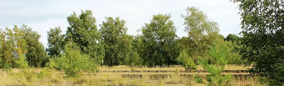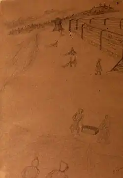 Für die Aufsicht der Siemenskolonne war anfangs (bis Oktober 1942) die SS-Aufseherin Hertha Ehlert zuständig, die gutmütig war, selten Häftlinge meldete und die ständig hungrigen Häftlinge unauffällig mit Lebensmitteln beschenkte. Daher wurde sie gegen eine strengere Aufseherin ausgetauscht und strafversetzt.[25] Der Weg vom KZ Ravensbrück führte am Schweinestall und an der Gärtnerei vorbei über die Schienen zum Siemenslager. Am Weg lagen später das außerhalb der Lagermauern (1944) errichtete Krematorium und die provisorische Gaskammer des KZ. Die SS-Aufseherinnen waren keine Mitglieder der SS. Sie galten als Angehörige des „SS-Gefolges“, unterstanden jedoch der SS-Gerichtsbarkeit. Das Frauenkonzentrationslager Ravensbrück diente für neue SS-Aufseherinnen ab Anfang 1942 als zentrales Ausbildungslager, die später in andere KZ oder Außenlager versetzt wurden.