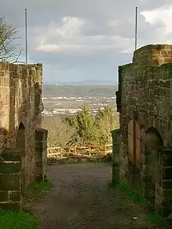Der Hauptzugang zur Burg kommt von der Nordostseite her und läuft an den östlichen Hauptbefestigungsanlagen vorbei. Anschließend trifft er auf die 6 bis 10 m breite Senke des Burggrabens, der sich um die Burg herumzog. Über eine Zugbrücke mit Hindernisschranken und weiter durch eine Torbastion, der durch vier hintereinander gelegene Burgtore gesichert war, gelangte man in den herzoglichen Teil der Burg. Dieser war vom Rest der Burg durch ein Mauer- und Grabensystem getrennt, dessen Überreste heute noch an der Quermulde auf dem Plateau erkennbar sind.