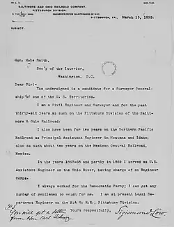 Sigismund Lows Brief an den US-Innenminister, in dem er sich um die Stelle eines Generalvermessers in New Mexico bewirbt. Darin beschreibt er seine Erfahrungen und schreibt über Briefpapier der Baltimore and Ohio Railroad.