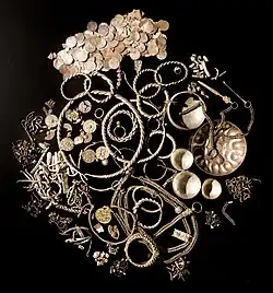 Der Hort enthielt 6,6 kg Silber, darunter 1751 Münzen, von denen 1708 arabische Dirhem aus Kufa im heutigen Irak sind. 28 ganze Münzen und 15 Fragmente stammen aus Europa; 11 aus Deutschland, 10 aus England, drei aus Frankreich und eine aus Italien. Darüber hinaus gab es 18 Münzen aus Dänemark, von denen acht aus Haithabu waren. Die ältesten Münzen wurden im Jahr 706 n. Chr. geprägt, während die jüngsten aus dem Jahr 944 stammten. Ein Fragment mit der lateinischen Inschrift „BATIS“ stammt aus einer Patene. Die anderen Gegenstände sind Armbänder, Bruchsilber, Halsketten und Trachtenschmuck, außerdem ein Trinkservice mit vier nordischen Tassen und einer großen Schüssel, sowie Schnallen, die möglicherweise aus Persien stammen.