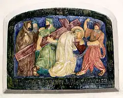 Valentin Kraus: „Simon von Cyrene hilft Jesus das Kreuz zu tragen“, 1926 (Kreuzwegstation an der Altöttinger Kapelle bei St. Nikolai am Gasteig, München)