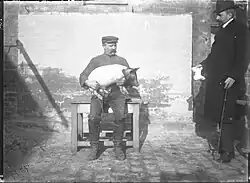 Professor Simon von Nathusius begutachtet ein im Haustiergarten gezüchtetes Hannover-Braunschweigisches Landschwein, präsentiert von Hofmeister Müller, 1911[11]