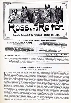 Unsere Pferdezucht und Remontierung, Artikel von Simon von Nathusius in der Zeitschrift Ross und Reiter, Illustrierte Wochenschrift für Pferdekunde, – Gebrauch und -Zucht, Offizier-Pferde-Verein GmbH, 3. Jahrgang, Nr. 38, 19. September 1903, Berlin, 1903[11]