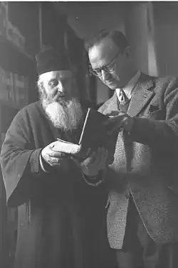 Archimandrit Christophoros und UNESCO-Repräsentant Gérard Garitte in der Klosterbibliothek (1957)