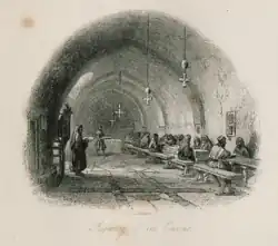 Im 13. Jahrhundert ließen sich einige lateinische Mönche im Kloster nieder und erbauten die Kapelle St. Katharina der Franken. „Mönche vom Sinai zogen nach Frankreich, um Geld zu sammeln und Reliquien zu verkaufen; heute besitzt die Kathedrale von Rouen mehr Reliquien der heiligen Katharina als das Kloster …“[31] Pilger aus Lateineuropa ritzten ihre Namen und Wappen in die Mauern des Katharinenklosters, vor allem im Refektorium, wo sie anscheinend ihre Mahlzeiten einnahmen.[32]