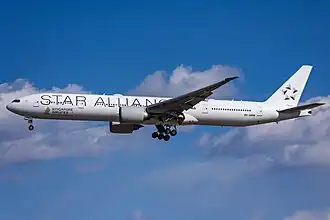 Bei dem verunglückten Flugzeug handelte es sich um eine Boeing 777-312ER. Die Maschine wurde im Werk von Boeing in Everett im Bundesstaat Washington endmontiert und absolvierte am 19. Februar 2008 ihren Erstflug, ehe sie am 29. Februar 2008 neu an die Singapore Airlines ausgeliefert wurde, welche die Maschine mit dem Luftfahrzeugkennzeichen 9V-SWM zuließ. Das Flugzeug trug die Werknummer 34578 und die Modellseriennummer 701. Das zweistrahlige Großraumflugzeug war mit zwei Triebwerken des Typs General Electric GE90-115B ausgestattet. Im April 2019 hatte die Maschine eine Sonderbemalung in weiß mit Schriftzügen der Star Alliance erhalten. Von November 2020 bis April 2024 wurde die Maschine als sogenannter „Preighter“ genutzt, es wurde also (leichte) Fracht anstelle von Passagieren im Passagierabteil transportiert.