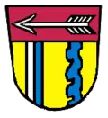 Unter rotem Schildhaupt, darin ein waagrechter silberner Pfeil, in Gold rechts ein von Silber und Blau gespaltener Pfahl, links ein blauer Wellenpfahl.