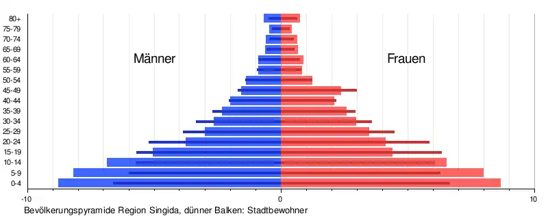 Größte Volksgruppen in Singida sind die Nyiramba, Nyaturu, Kimbu, Gogo, Isanzu, Taturu, Sukuma, Mang'ati, Barabaig und Hadzabe. Ferner leben hier wenige Nyamwezi und Luo aus anderen Regionen und vorwiegend in Städten einige Asiaten und Araber.[3] Die Bevölkerungspyramide zeigt eine breite Basis. Das weist auf eine hohe Geburtenrate und eine jugendliche Altersstruktur hin, wie sie für viele afrikanische Gebiete typisch ist. Betrachtet man aber die Stadtbevölkerung, so zeigt diese Pyramide eine Ausbuchtung in der Altersgruppe 15 bis 24 Jahre, besonders bei den Frauen. Dies deutet auf eine Zuwanderung aus anderen Regionen oder von ländlichen Gebieten hin.[12]