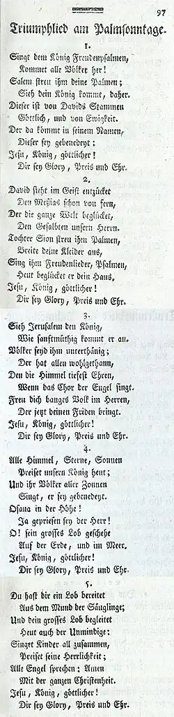 Der Text[2] findet sich mit einer neu komponierten Melodie[3] erstmals im zweiten Teil des Gesang- und Andachtsbuchs Der heilige Gesang zum Gottesdienste in der römisch-katholischen Kirche, Salzburg 1783, und trägt dort die Überschrift „Triumphlied am Palmsonntage“. Im Inhaltsverzeichnis heißt es „Kirchenlied am Palmsonntag nach der Palmweyhe bey der Proceßion“.[4] Das ist der liturgische Ort des Liedes bis heute.