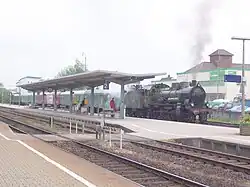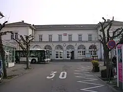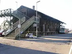 ![]() Das Empfangsgebäude und der Aufgang zur Fußgängerbrücke von der Stadtseite aus gesehen