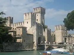 Die Scaligerburg schließt das Städtchen mit einem großen Hafenbecken und einer Ringmauer vom Festland ab. Die Scaliger erbauten die unter Antonio della Scala (1363–1388) im 14. Jahrhundert fertiggestellte Burg, die dem Hafen der Gardaseeflotte Schutz bot. Die für rein militärische Zwecke errichtete Anlage diente den Scaligern nicht nur zum Schutz vor äußeren Feinden, sondern sollte auch vor Übergriffen aus der Bevölkerung Schutz bieten. Die bestens erhaltene Anlage prägt heute das Bild von Sirmione. Nur über eine Brücke gelangt man über den tiefen Wassergraben durch ein Portal mit den Wappen der Scaliger (eine Leiter) und der Venezianer (geflügelter Löwe) in die Burg, von der aus man den Zugang zur Ortschaft kontrollieren konnte. Schießscharten zeigen, wie die Burgsoldaten von hier aus den Weg nach Sirmione kontrollierten. Bei einem Rundgang über die Wehrgänge und durch die Ecktürme kann sich der Besucher ein Bild von dem ausgeklügelten Verteidigungssystem aus dicken Mauern, Treppen und Zugbrücken machen. Zur Burg gehört auch der einzigartige und bestens erhaltene ummauerte Hafen, der zusammen mit der Burg errichtet wurde. Überragt wird die Burg vom 37 Meter hohen Bergfried, der im Rahmen der Burgbesichtigung bestiegen werden kann. Die Burg untersteht der staatlichen Museumsverwaltung der Provinz Brescia und kann gegen Eintritt besichtigt werden. Seit 2018 ist auch der restaurierte Burghafen für Besucher geöffnet.[5]