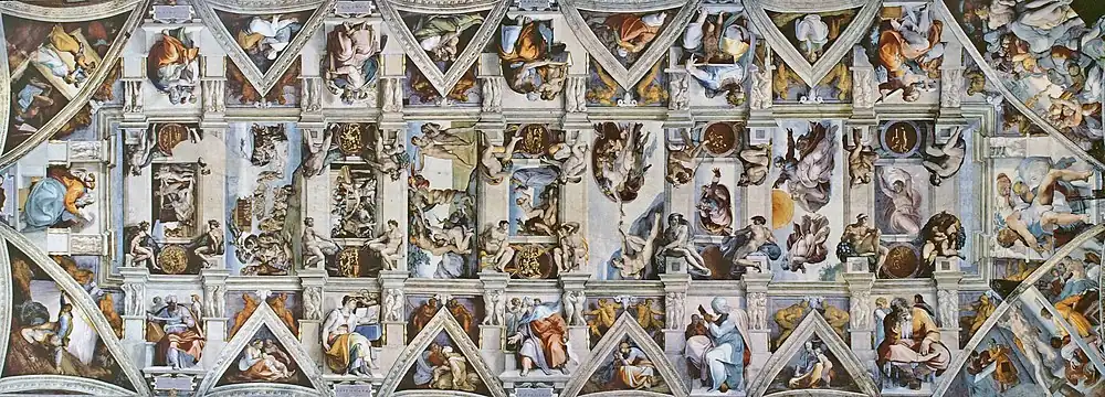 Die Decke der Sixtinischen Kapelle war zur Zeit ihrer Weihe ornamental verziert, möglicherweise als Sternenhimmel gestaltet.[4] Besondere Berühmtheit erlangte sie durch ihre spätere Ausschmückung mit Fresken. Die Deckenmalereien schuf Michelangelo Buonarroti zwischen 1508 und 1512 im Auftrag von Papst Julius II. Sie wurden am Vorabend des Allerheiligenfestes 1512 enthüllt[5] und zeigen Szenen aus der Genesis auf insgesamt 520 m² mit 115 überlebensgroßen Charakteren. Besonders der Ausschnitt Die Erschaffung Adams ist ein weltbekanntes und oft reproduziertes Werk. Es zeigt, wie Gottvater mit ausgestrecktem Finger Adam zum Leben erweckt.