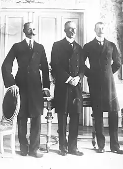 Es kam auch zum Bruch zwischen den Königshäusern, der bis zum Dreikönigstreffen 1914 in Malmö anhielt. Die Gegner waren nahe Verwandte. Der schwedische König Oskar II. war Großonkel des dänischen Prinzen und späteren norwegischen König Carl, gekrönt als Håkon VII. Sie trafen sich ab 1905 nicht mehr, abgesehen von einer Begegnung im Herbst 1906.[41] Der dänische König Christian IX. starb im Januar 1906. Sein Begräbnis wurde zum Problem. Håkon VII. musste inkognito durch Schweden reisen, und König Gustav kam nicht, sondern seine Söhne.[42] Die wichtigen Dreikönigstreffen fanden 1914 in Malmö und 1917 in Christiania statt. Das Verhältnis blieb empfindlich bis zur völligen Aussöhnung bei der Hochzeit zwischen Kronprinz Olav und Prinzessin Märtha 1929.