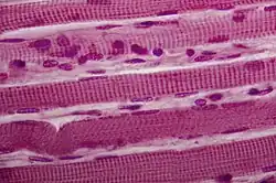 Jede Muskelfaser ist aus Tausenden fadenförmiger Strukturen aufgebaut, den sogenannten Myofibrillen. Diese durchziehen nebeneinander die Muskelfaser der Länge nach und sind aus kleineren Einheiten aufgebaut, den Myofilamenten. In diesen Eiweißstrukturen verläuft die Muskelkontraktion durch gegenseitiges Ineinanderschieben. Die Anordnung der Myofilamente in den Sarkomeren bedingt die mikroskopisch sichtbare Querstreifung der Muskelfasern.