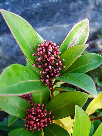 Skimmia japonica – knospige Blütenstände einer Kulturform | ||||||||||||