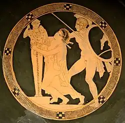 Anders als nach römischem Recht durfte ein Sklavenhalter einen Sklaven nicht willkürlich töten. Nach Isokrates durfte nicht einmal der wertloseste Sklave ohne Prozess hingerichtet werden.[78] Drakons Gesetz bestrafte offenbar auch den Mörder eines Sklaven mit dem Tod.[79] Die Klage gegen den Mörder eines Sklaven (δίκη φονική díkē phonikḗ) war nicht auf Schadenersatz gerichtet, sondern sollte die durch das vergossene Blut verursachte religiöse Verunreinigung bestrafen. Daher war im 4. Jahrhundert v. Chr. nicht der Areopag, sondern das Gericht des Palladion für die Bestrafung zuständig. Die von ihm ausgesprochene Strafe war offenbar härter als eine Geldstrafe, aber geringer als der Tod – möglicherweise die Verbannung, wie für fahrlässige Tötung oder für die Ermordung eines Metöken.[80]