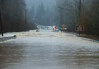 ![]() U.S. Highway 101 nördlich von Shelton am 3. Dezember 2007. Das Wasser des Skokomish Rivers steht etwa 120 cm hoch auf der Fahrbahn | ||